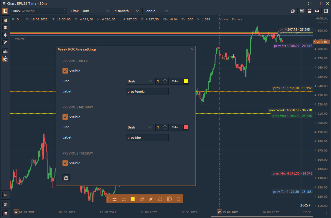 Тижнева лінія POC показує щоденні та тижневі максимальні рівні об'єму (точка контролю). У налаштуваннях інструменту ви можете вибрати дні для відображення на графіку - Поточний або Попередній.