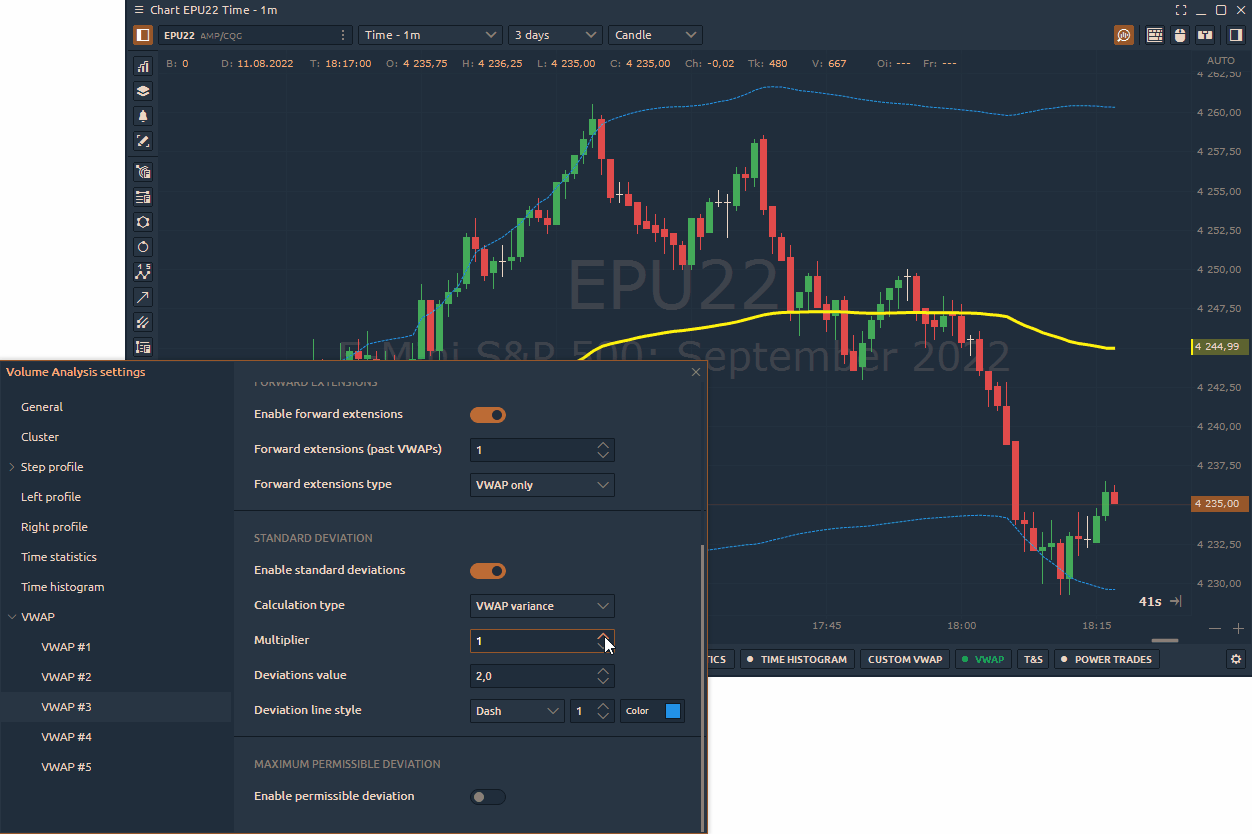 У новій версії платформи ми додали можливість відображати кілька рівнів стандартного відхилення використовуючи множник. В налаштуваннях VWAP вкажіть розмір STD, а також кількість рівнів.